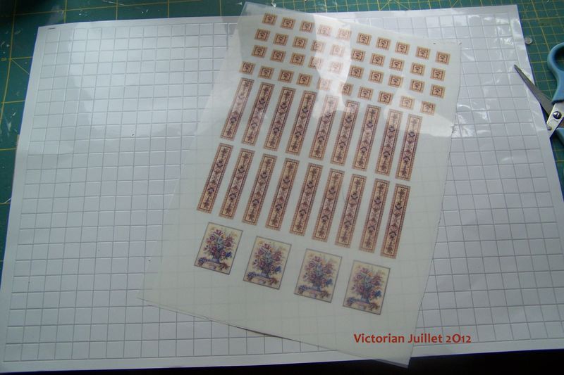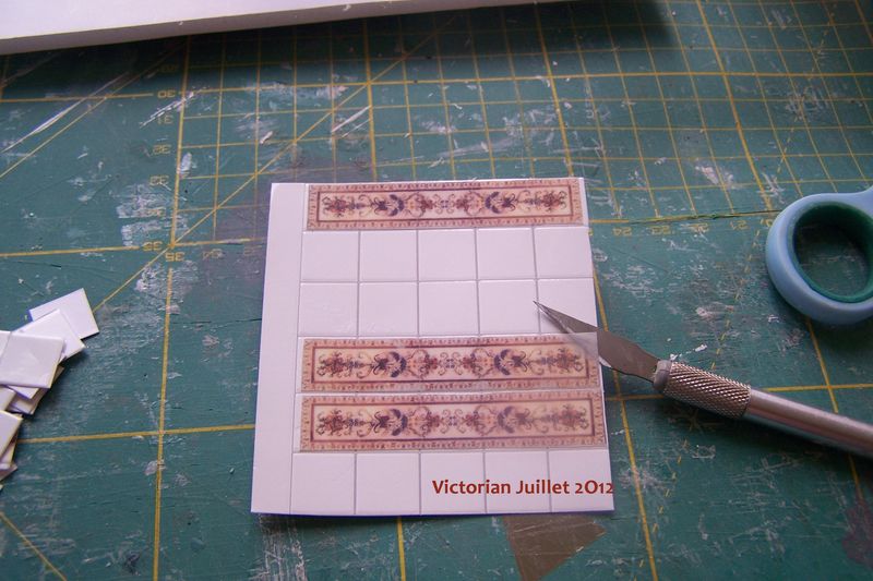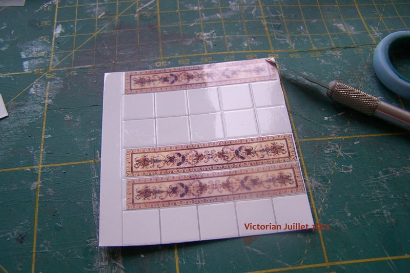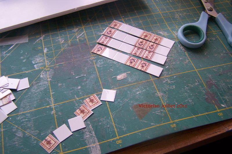 Il restait donc à découper le nombre de carreaux blancs necessaires et à coller les transferts sur les carreaux