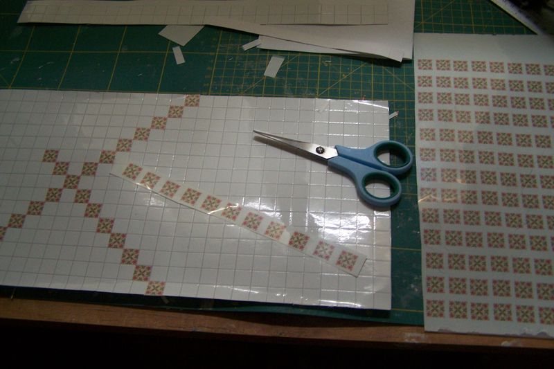 Pour plus de facilité les bandes et le motif central on été collés d'un bloc et les carreaux découpés ensuite.